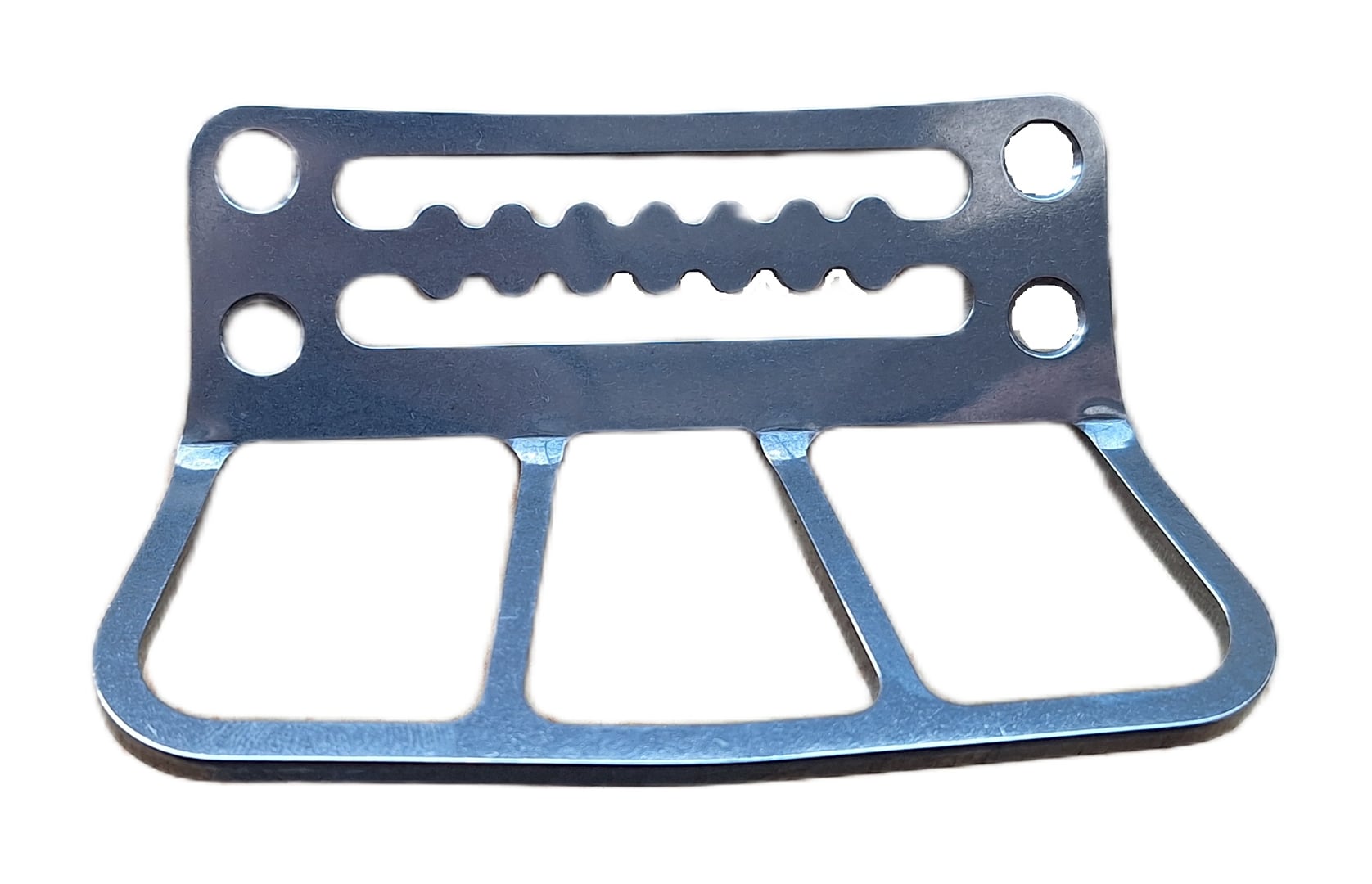 Zubatá stopka s otvory pro 5 mm gumolano v kombinaci s D kroužkem rozděleným na 3 segmenty. Montáž na 50 mm popruh.