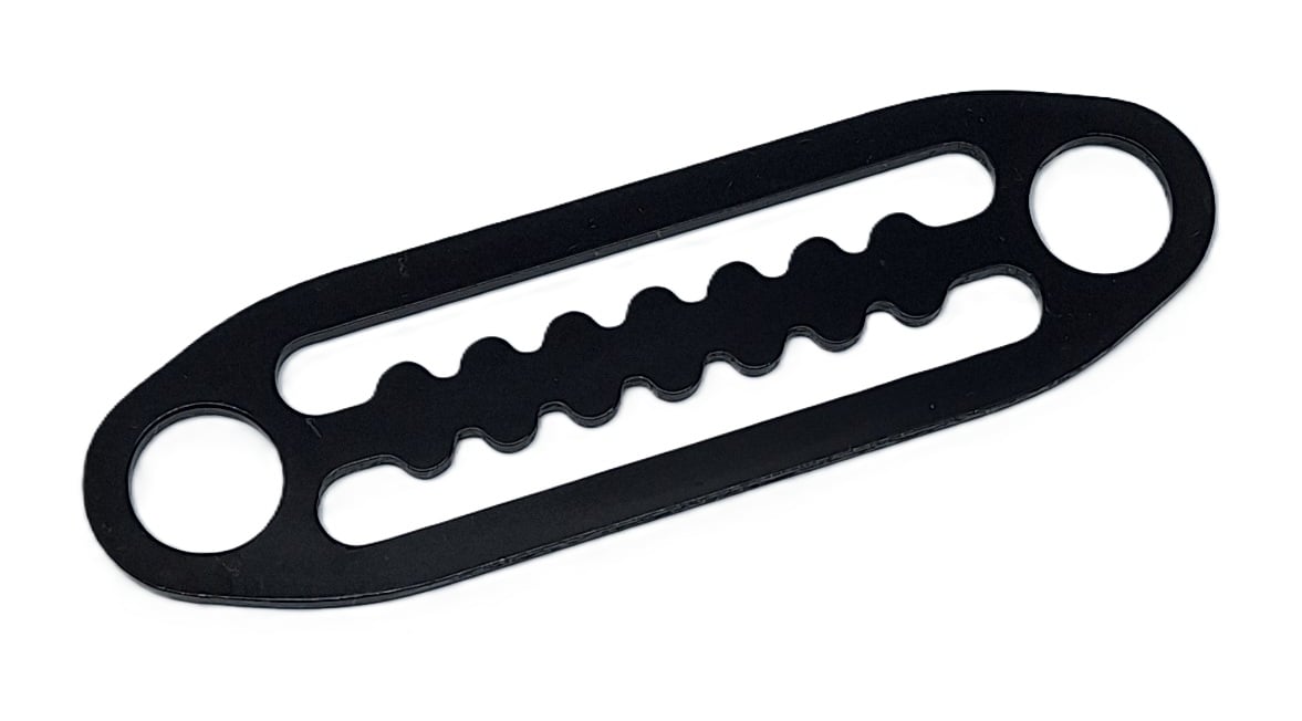 Dvojitá zubatá stopka s okem pro montáž na 50 mm popruh v čené barvě.